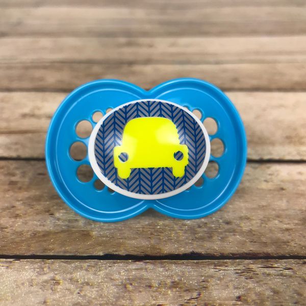 6 Mo Yellow Car Pacifier With Blue Shield Lucky Stars Leather